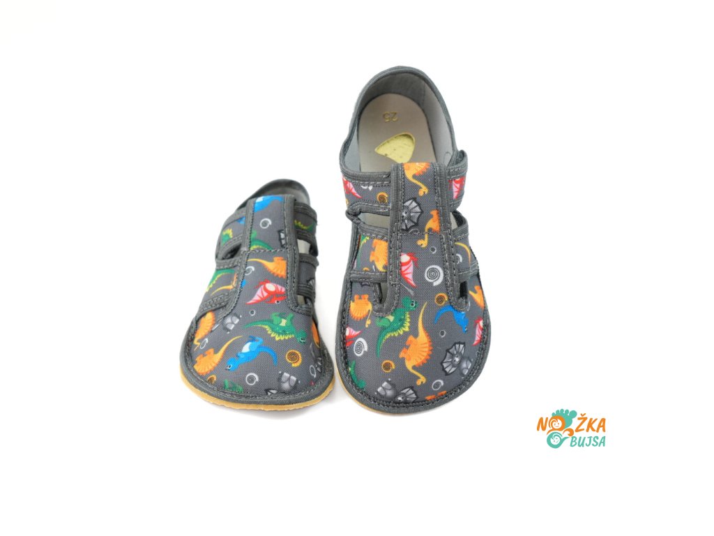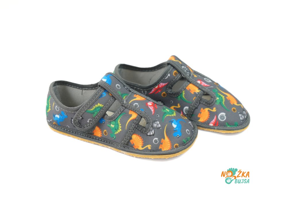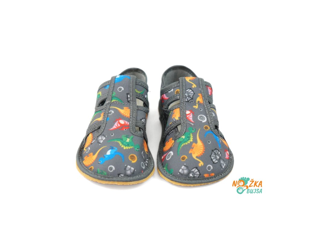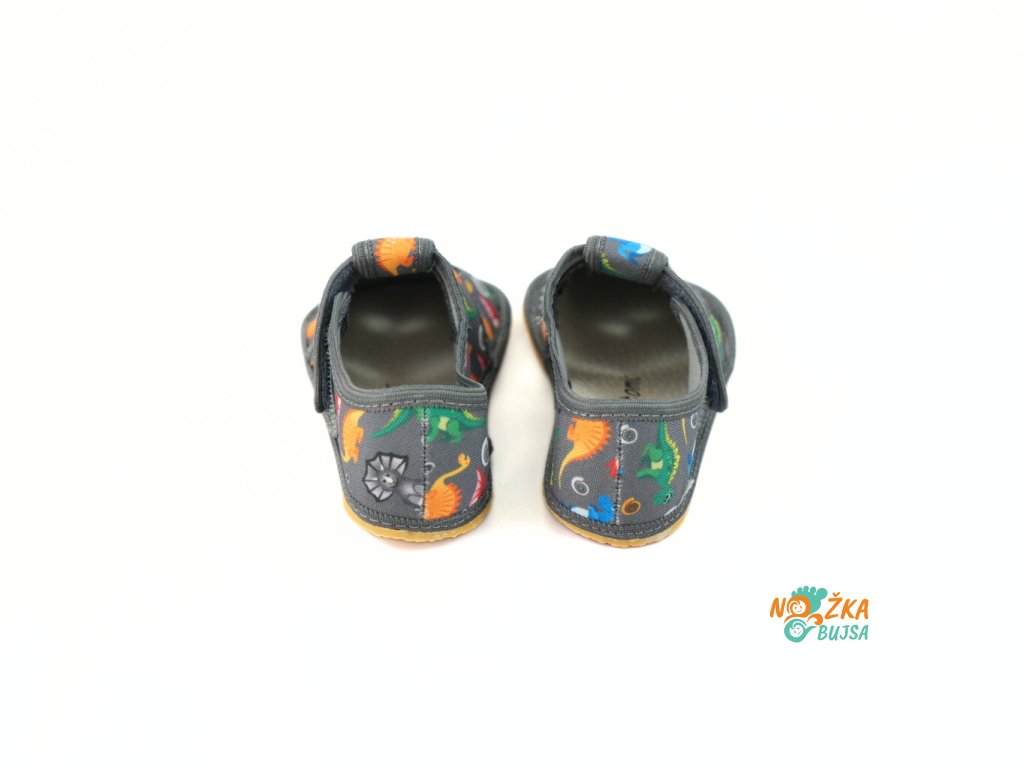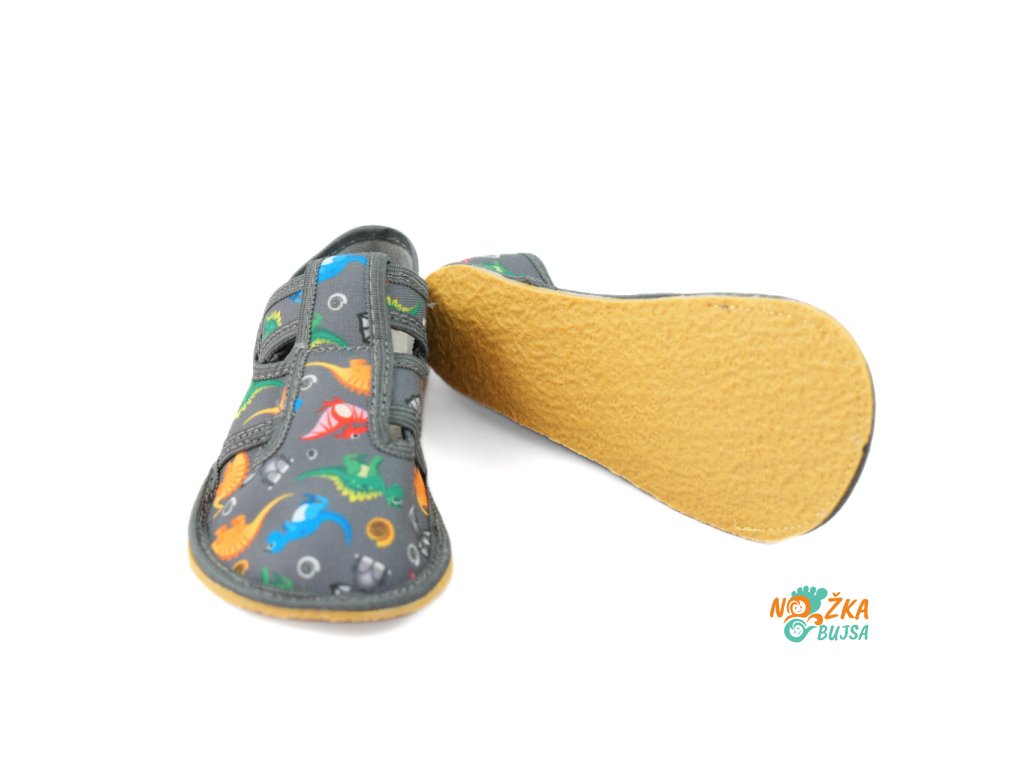 Papuče sú ušité z jednej vrstvy textilu, vďaka čomu sú vzdušné a pohodlné. Majú hravý detský dizajn, ktorý poteší každého chlapca, či už má rad dinosaury alebo autíčka. Zvrchu kožená stielka je rovná bez tvarovania, a v prípade potreby ju viete jednoducho vybrať. Pod ňou je vrstva textilu, takže sa papuče dajú pohodlne nosiť aj bez nej. Papuče sú čiastočne otvorené, takže chodidlo sa v nich nepotí a vzduch prirodzene cirkuluje. Podrážka je vyrobená zo silného termoplastického kaučuku s hrúbkou iba 3mm, čo zabezpečuje jej protišmykovosť, ohybnosť a veľmi dobrú odolnosť obuvi. Je flexibilná, ohybná priečne aj pozdĺžne s nulovým rozdielom medzi pätou a špicou, tzv. „zero drop". Päta je čiastočne spevnená, dobre drží tvar a dodáva vertikálnu oporu päty dieťaťa. Sú určené na nosenie v interiéri.