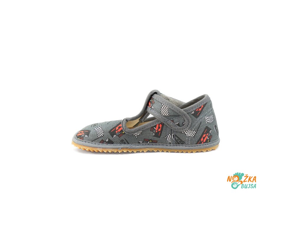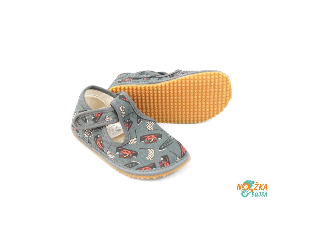 Zvršok aj podšívka je z textilu v rôznom farebnom prevedení a zaujímavými vzormi, z ktorých si vyberie každé dieťa. Textilná stielka je rovná bez tvarovania a v prípade potreby ju viete jednoducho vybrať. Vďaka anatomicky tvarovanej špičke má dieťa dostatok miesta na prsty a ich voľnejší pohyb. Papuče majú protišmykovú gumenú podrážku, ktorá je ohybná priečne aj pozdĺžne s nulovým rozdielom medzi pätou a špicou, tzv. „zero drop". Päta je mierne vystužená, ale nie je pevná, dobre drží tvar a dodáva vertikálnu oporu päty dieťaťa. Sú určené na nosenie v interiéri.