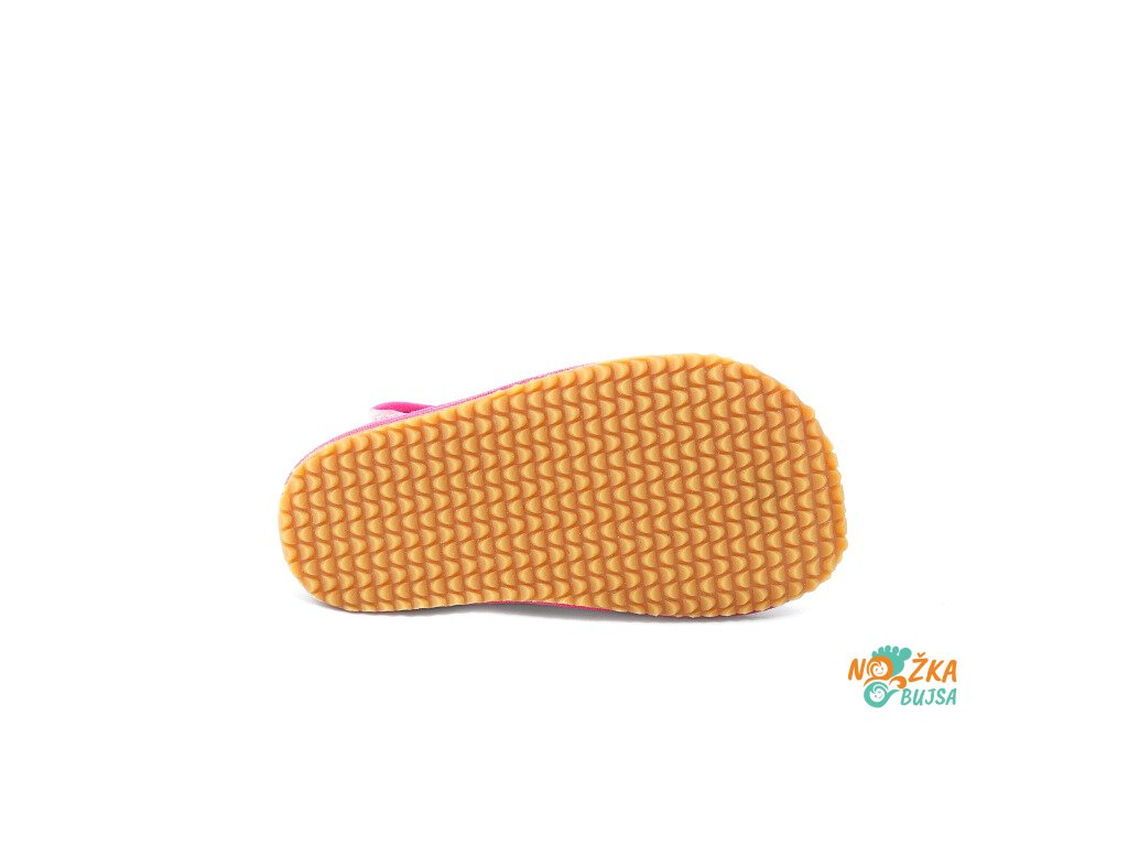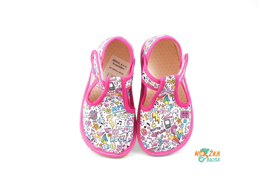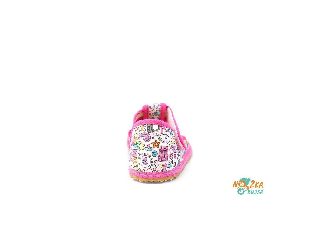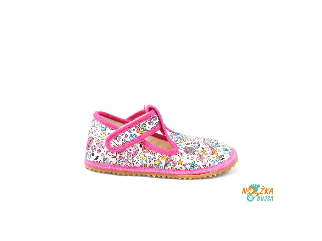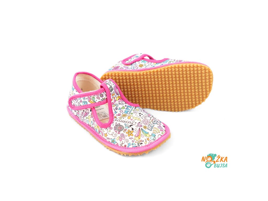 Zvršok aj podšívka je z textilu v rôznom farebnom prevedení a zaujímavými vzormi, z ktorých si vyberie každé dieťa. Textilná stielka je rovná bez tvarovania a v prípade potreby ju viete jednoducho vybrať. Vďaka anatomicky tvarovanej špičke má dieťa dostatok miesta na prsty a ich voľnejší pohyb. Papuče majú protišmykovú gumenú podrážku, ktorá je ohybná priečne aj pozdĺžne s nulovým rozdielom medzi pätou a špicou, tzv. „zero drop". Päta je mierne vystužená, ale nie je pevná, dobre drží tvar a dodáva vertikálnu oporu päty dieťaťa. Sú určené na nosenie v interiéri.