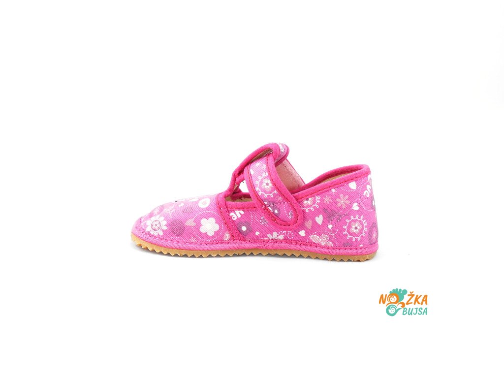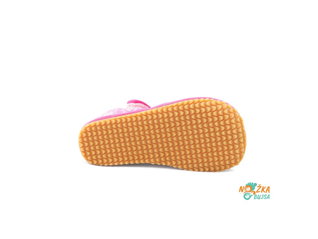 Zvršok aj podšívka je z textilu v rôznom farebnom prevedení a zaujímavými vzormi, z ktorých si vyberie každé dieťa. Zvrchu textilná stielka je rovná, s miernym tvarovaním v oblasti päty, vďaka čomu chodilo pekne sedí v topánke a nelieta. V prípade potreby ju viete jednoducho vybrať. Vďaka anatomicky tvarovanej špičke má dieťa dostatok miesta na prsty a ich voľnejší pohyb. Papuče majú protišmykovú gumenú podrážku, ktorá je ohybná priečne aj pozdĺžne s nulovým rozdielom medzi pätou a špicou, tzv. „zero drop". Päta je mierne vystužená, ale nie je pevná, dobre drží tvar a dodáva vertikálnu oporu päty dieťaťa. Sú určené na nosenie v interiéri.