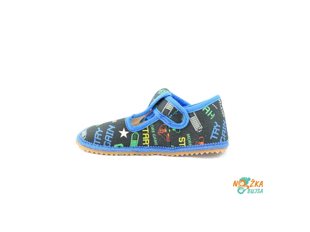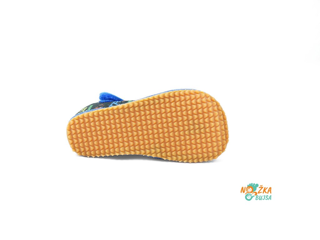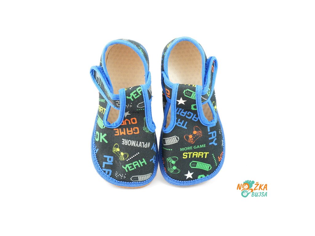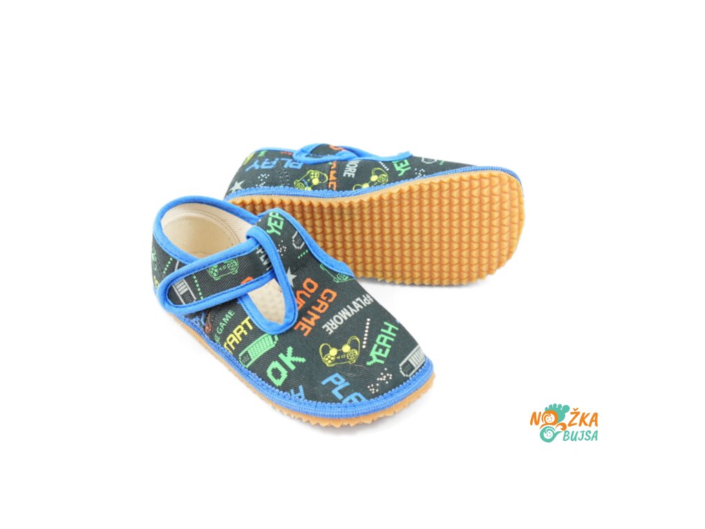 Zvršok aj podšívka je z textilu v rôznom farebnom prevedení a zaujímavými vzormi, z ktorých si vyberie každé dieťa. Textilná stielka je rovná bez tvarovania a v prípade potreby ju viete jednoducho vybrať. Vďaka anatomicky tvarovanej špičke má dieťa dostatok miesta na prsty a ich voľnejší pohyb. Papuče majú protišmykovú gumenú podrážku, ktorá je ohybná priečne aj pozdĺžne s nulovým rozdielom medzi pätou a špicou, tzv. „zero drop". Päta je mierne vystužená, ale nie je pevná, dobre drží tvar a dodáva vertikálnu oporu päty dieťaťa. Sú určené na nosenie v interiéri.