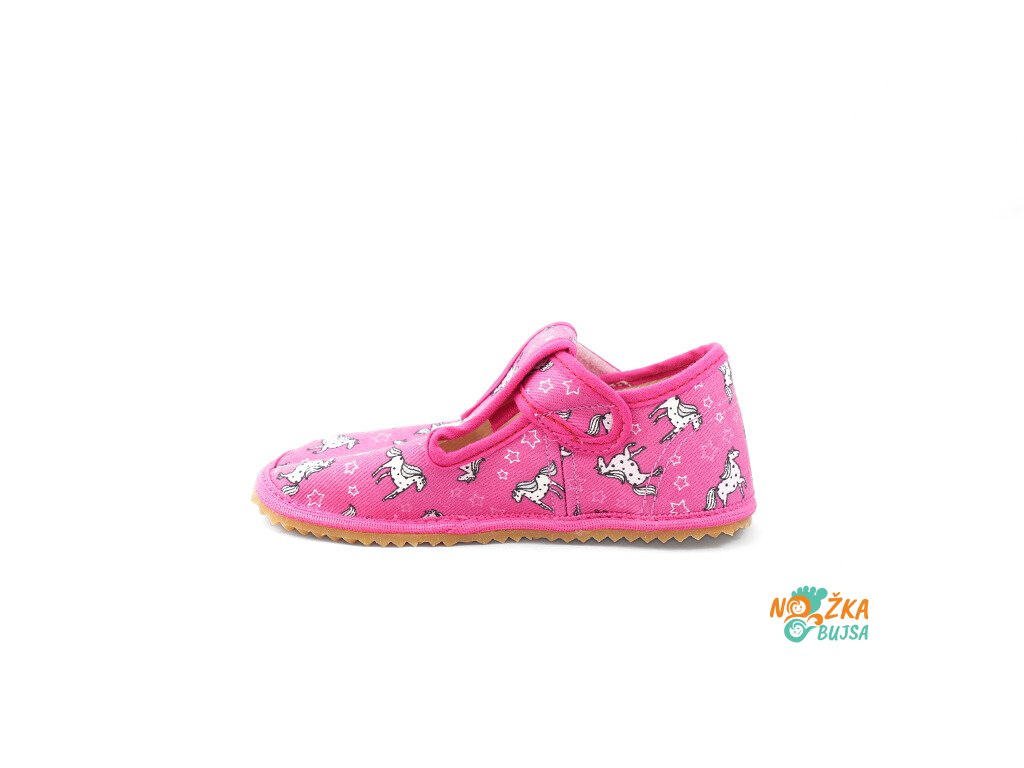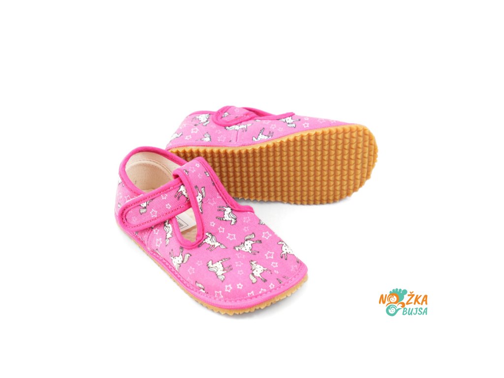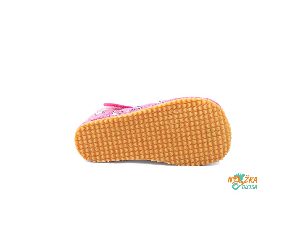 Zvršok aj podšívka je z textilu v rôznom farebnom prevedení a zaujímavými vzormi, z ktorých si vyberie každé dieťa. Textilná stielka je rovná bez tvarovania a v prípade potreby ju viete jednoducho vybrať. Vďaka anatomicky tvarovanej špičke má dieťa dostatok miesta na prsty a ich voľnejší pohyb. Papuče majú protišmykovú gumenú podrážku, ktorá je ohybná priečne aj pozdĺžne s nulovým rozdielom medzi pätou a špicou, tzv. „zero drop". Päta je mierne vystužená, ale nie je pevná, dobre drží tvar a dodáva vertikálnu oporu päty dieťaťa. Sú určené na nosenie v interiéri.