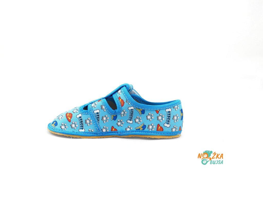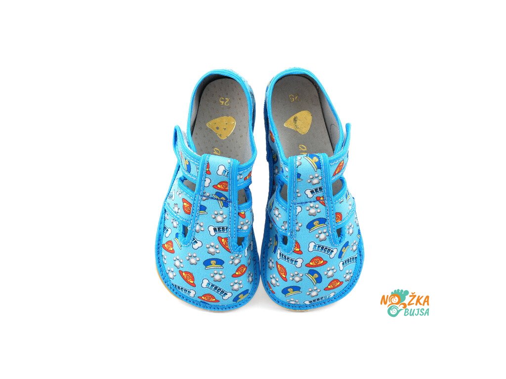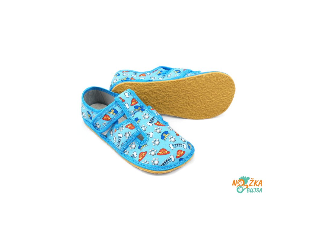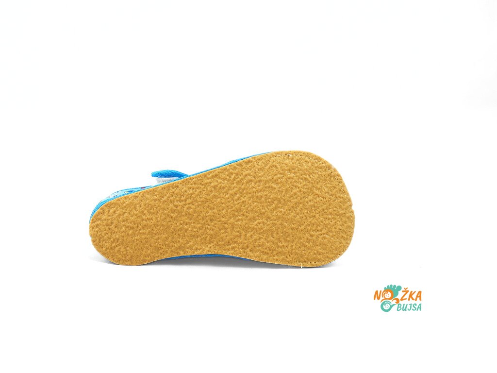 Papuče sú ušité z jednej vrstvy textilu, vďaka čomu sú vzdušné a pohodlné. Majú hravý detský dizajn, ktorý poteší každého chlapca, či už má rad dinosaury alebo autíčka. Zvrchu kožená stielka je rovná bez tvarovania, a v prípade potreby ju viete jednoducho vybrať. Pod ňou je vrstva textilu, takže sa papuče dajú pohodlne nosiť aj bez nej. Papuče sú čiastočne otvorené, takže chodidlo sa v nich nepotí a vzduch prirodzene cirkuluje. Podrážka je vyrobená zo silného termoplastického kaučuku s hrúbkou iba 3mm, čo zabezpečuje jej protišmykovosť, ohybnosť a veľmi dobrú odolnosť obuvi. Je flexibilná, ohybná priečne aj pozdĺžne s nulovým rozdielom medzi pätou a špicou, tzv. „zero drop". Päta je čiastočne spevnená, dobre drží tvar a dodáva vertikálnu oporu päty dieťaťa. Sú určené na nosenie v interiéri.