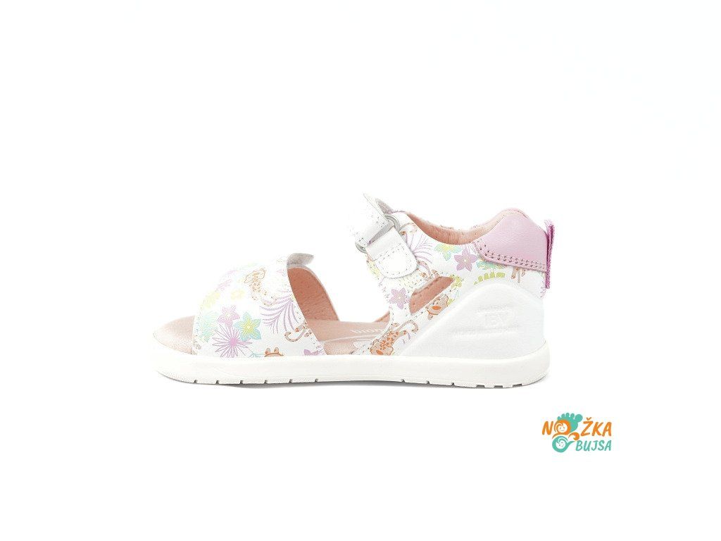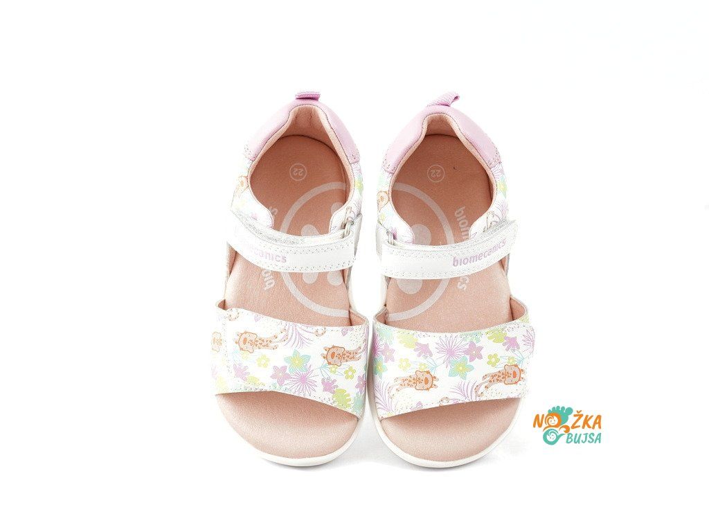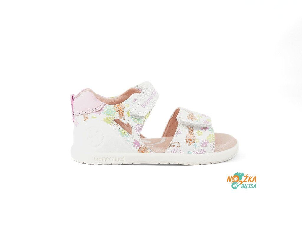 Detské barefoot sandále Biomecanics Estampada Blanco sú krásne kožené sandále v jemnej bielo-ružovej kombinácii s milým kvetinovým vzorom. Vďaka otvorenej prstovej časti sú výborne vzdušné a ideálne do horúceho leta. Skvelo sa hodia k šatám, sukniam, ale aj legínam či letným kraťasom.