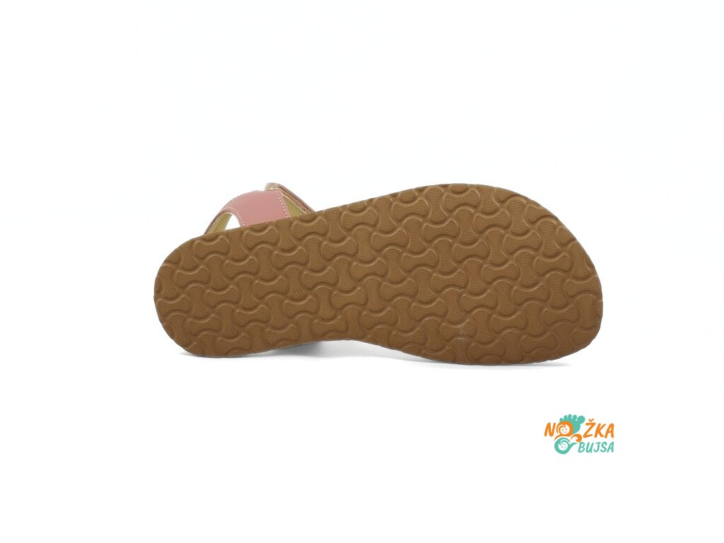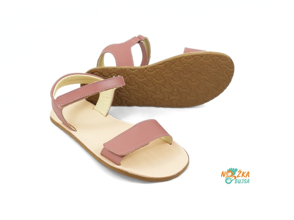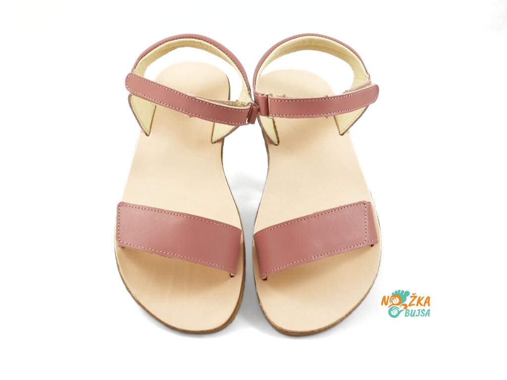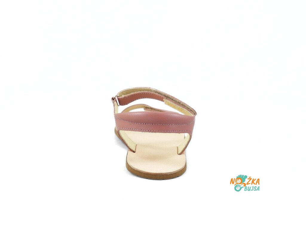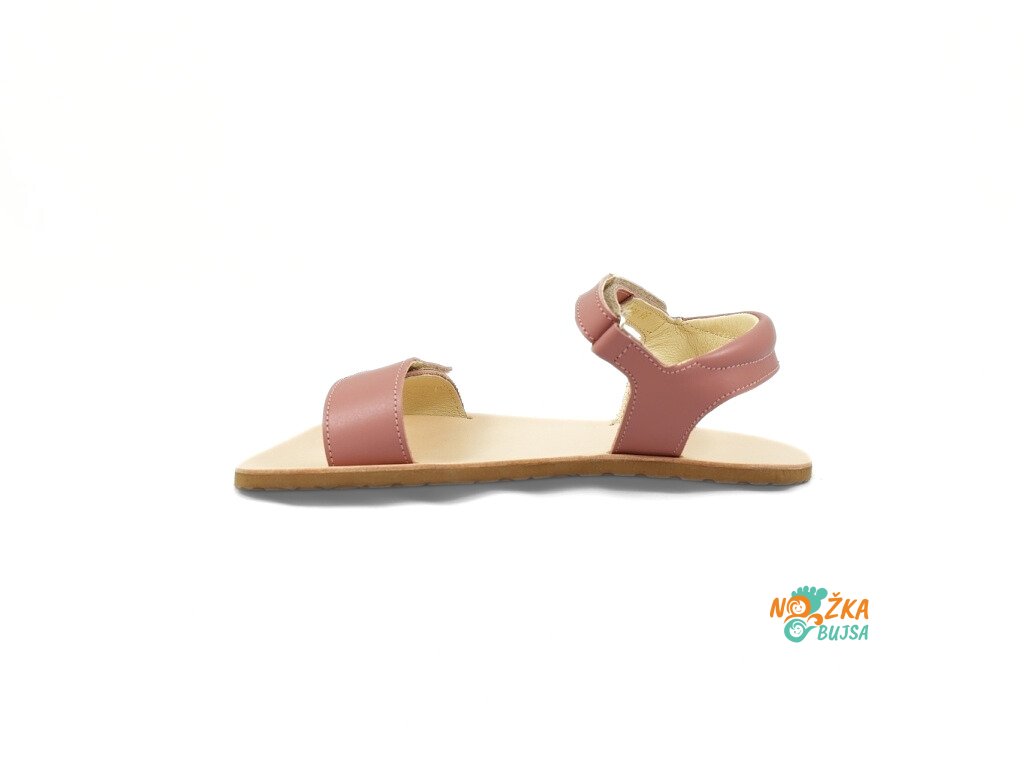 Zvršok aj podšívka je z hladkej kože, ktorá neobsahuje chróm a iné toxické látky. Sandále sú v jemnej ružovej farbe s minimalistikýmprešívaním, ktoré dotvára ich nadčasový dizajn. Kožená stielka tvorí súčasť topánočky, nie je možné ju vybrať, je rovná bez tvarovania. Sandále majú flexibilnú gumenú podrážku, ktorá je mäkká a ohybná v každom smere s nulovým rozdielom medzi pätou a špicou, tzv. „zero drop“. Sandále sú veľmi ľahké a vzdušné s mäkkým polstrovaním okolo členku pre ešte lepší pocit z nosenia.